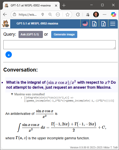 Maxima is also easily scriptable, making it useful as an embedded computer algebra system. Maxima is integrated within the WISPL chatbot, allowing language models to invoke Maxima on request for complex calculations.